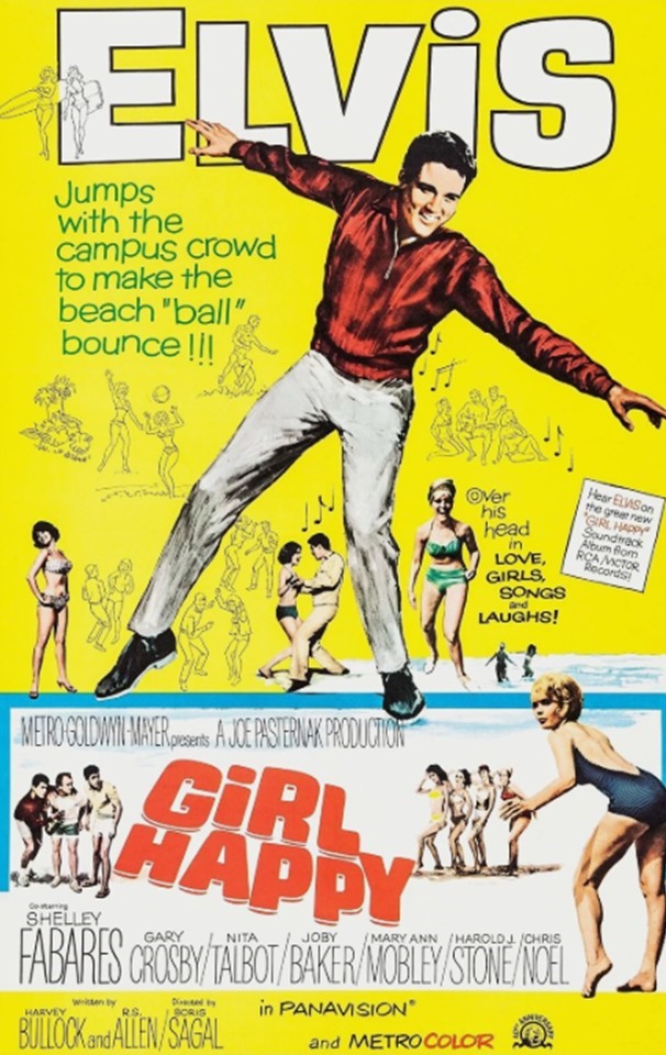 In a scene with Mary Ann MobleyMOVIE DIRECTORYMOVIE TRAILERGIRLHAPPYWORKING TITLES "GIRL HAPPY" won fourth place at the 1965 Laurel Awards in the category of Top Musical. "THE UNSINKABLE MOLLY" BROWN was the winner for that year.GIRLHAPPYLOCATION Alternate titles considered were "THE ONLY WAY TO LOVE" and "GIRL CRAZY." WORKING TITLES PREVIOUSGIRLHAPPYBOX OFFICE Elvis in the role of Rusty Wells.LOCATIONEven though the film is set in Fort Lauderdale, Elvis did not film any scenes in the city. The primary shooting was done at the MGM studios in California, while the beach scenes were filmed in southern California. Only second unit filming was done in Fort Lauderdale. WORKING TITLESGIRLHAPPYCAST NEXT Scene still with Shelley Fabares.BOX OFFICEMGM released "GIRL HAPPY" on Wednesday, April 7, 1965, and grossed $3.1 million in the United States. LOCATIONCASTGIRL BOX OFFICEPLOT BEGINS Elvis Presley as Rusty WellsHarold Stone as Big FrankShelley Fabares as Valerie FrankNita Talbot as Sunny DazeGary Crosby as AndyJoby Baker as WilburJimmy Hawkins as DocFabrizio Mioni as Romano OrladaMary Ann Mobley as Deena ShepherdPeter Brooks as Brentwood Von DurgenfeldJohn Fiedler as Mr. PenchillJackie Coogan as Sgt. BensonChris Noel as BetsyDan Haggerty as CharlieHAPPYIn a scene in "GIRL HAPPY" with co-stars Joby Baker and Jimmy Hawkins.PLOTGIRL CASTPLOT (CONTINUES) HAPPYNightclub singer Rusty Wells (played by Elvis Presley) and his band have just closed their Chicago engagement and are leaving for their annual spring vacation to Fort Lauderdale, Florida. The club owner, mobster Big Frank (played by Harold Stone), has other plans and extends their stay at his club.At the same time, Big Frank's daughter, Valerie Frank (played by Shelley Fabares), a young college student takes her spring break in Fort Lauderdale with her friends, causing Big Frank a lot of worries. Big Frank’s concern for the welfare of his daughter, forces him to change his mind and hires Rusty and his band to make the trip to Fort Lauderdale to look after his daughter. MOVIE RENTAL OR PURCHASEGIRLPLOT (CONTINUED) PLOTBACK TO MOVIE DIRECTORYSOUNDTRACK HAPPYThe job proves to be difficult when Rusty and the guys fight to keep the Italian exchange student, Romano Orlada (played by Fabrizio Mioni), away from Valerie. At the same time, Rusty has to keep explaining the situation to his impatient love interest, Deena Shepard (played by Mary Ann Mobley).Eventually, Rusty and Valerie fall in love. When Big Frank reveals to his daughter that he's paying Rusty to watch over her, Valerie becomes angry and causes a ruckus at a local nightclub which lands everyone in jail. Big Frank eventually arrives in Fort Lauderdale to get Valerie out of jail. When he sees how much in love Rusty and Valerie are, he steps aside to allow love to flow."Girl Happy" is the tenth soundtrack album by Elvis Presley from 1965 for the MGM movie of the same name and was released by RCA Victor. It reached number 8 on the Top LP's chart and includes 12 songs that were recorded in June 1964 at Radio Recorders in Hollywood. The album is famous for its fun "Spring Break" vibe and popular tracks like "Puppet on a String."SOUNDTRACKMOVIE POSTER PREVIOUS FOR PLOTBACK TO MOVIE DIRECTORYSOUNDTRACK CONTINUES Scene still fromGirl HappyGIRLHAPPYBACK TO MOVIE DIRECTORYThis would be the first of three movies in which Shelley Fabares would co-star with Elvis. Fabares sings "SPRING FEVER" in a duet with Elvis.SOUNDTRACK - MOVIE'S MUSIC SOUNDTRACK BEGINS"SPRING FEVER" (Click Here for Movie Scene)