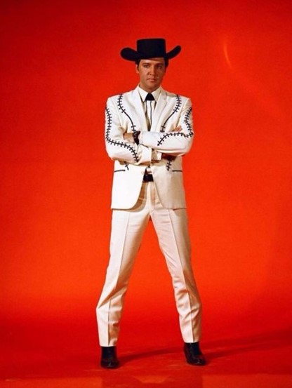 Flaming Star is a period western making this Elvis’s sixth film. At twenty-five, Elvis plays a mixed-race man whose mother is Kiowa and father is white. Elvis is outfitted in western designs indicative of the time. The costume designer for this 1960 movie was Adele Balkan.