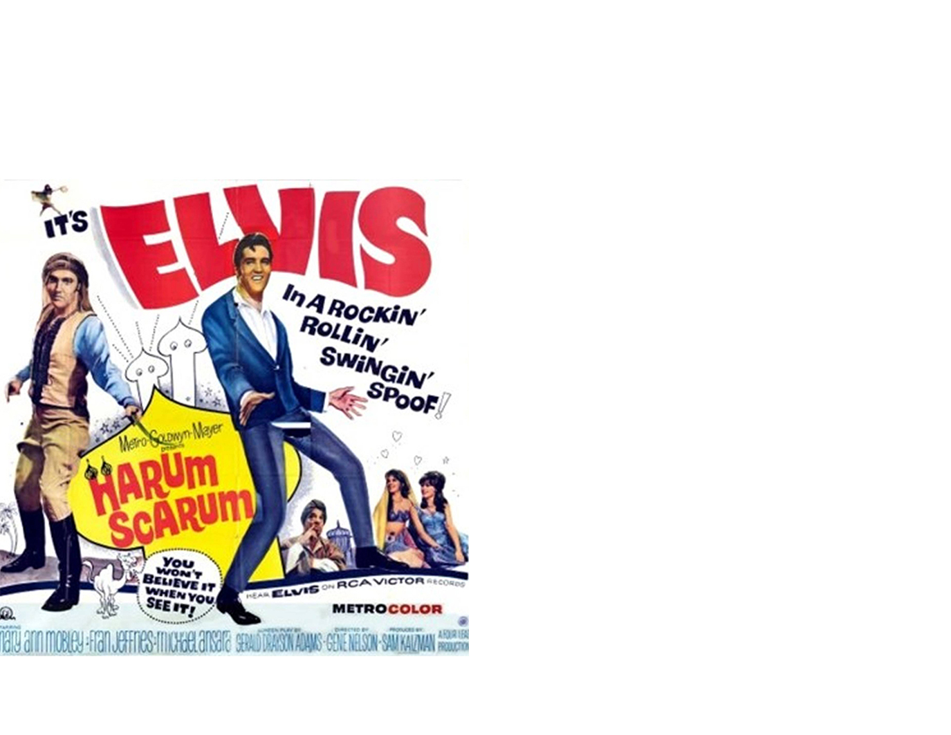 MOVIE DIRECTORY MOVIE TRAILER HARUM SCARUM NEXT Lobby Card from the film Harum Scarum HARUM SCARUM LOCATION PREVIOUS Some of this film was based on Rudolph Valentino's "THE SHEIK" released in 1921. The film is listed in Golden Raspberry Award founder John Wilson's book "THE OFFICIAL RAZZIE MOVIE GUIDE" as one of The 100 Most Enjoyably Bad Movies Ever Made. Elvis in the role of Johnny Tyronne. HARUM SCARUM BOX OFFICE PREVIOUS "HARUM SCARUM" was shot on the original Cecil B. DeMille set from the film "THE KING OF KINGS." Additional footage was shot on location at the Iverson Movie Ranch in Chatsworth, California. LOCATION MOVIE POSTER HARUM SCARUM CAST LOCATION The movie's release date was Wednesday, December 15, 1965. It grossed $1.5 mil in the United States. The film reached #11 on the Variety national weekly box office chart and finished #40 on the year-end list of the top-grossing films of 1965. BOX OFFICE The film was released in the United Kingdom as "HAREM HOLIDAY." CAST HARUM SCARUM BOX OFFICE PLOT NEXT Elvis Presley as Johnny Tyronne Fran Jeffries as Aishah Mary Ann Mobley as Princess Shalimar Michael Ansara as Prince Dragna Jay Novello as Zacha Theo Marcuse as Sinan Philip Reed as King Toranshah Jack Costanzo as Julna Billy Barty as Baba Jack Costanzo as Julna Dirk Harvey as Mokar Brenda Benet as Emerald Larry Chance as Captain Herat Barbara Werle as Leilah Gail Gilmore as Sapphire Vicki Malkin as Sari Wilda Taylor as Amethyst Ryck Rydon as Mustapha Joey Russo as Yussef HARUM SCARUM PLOT CAST SOUNDTRACK BACK TO MOVIE DIRECTORY MOVIE RENTAL OR PURCHASE American movie star Johnny Tyrone (played by Elvis Presley), travels through the Middle East on a goodwill tour to premiere his new picture, "SANDS OF THE DESERT." Johnny is kidnapped by a gang of assassins who enlists him in a sinister plot to kill King Toranshah (played by Philip Reed). Johnny refuses and escapes across the desert where he meets and falls in love with a slave girl, Shalimar (played by Mary Ann Mobley), who turns out to be King Toranshah's daughter. The "Harum Scarum" soundtrack, which came out in November 1965, is Elvis Presley's 11th soundtrack album that goes along with his movie of the same title.